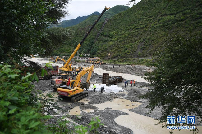 8月23日,搶險(xiǎn)人員在舟曲縣曲告納鎮(zhèn)境內(nèi)被沖毀的鐵壩河1號(hào)橋旁開展道路搶通作業(yè)。 新華社記者 郎兵兵 攝
