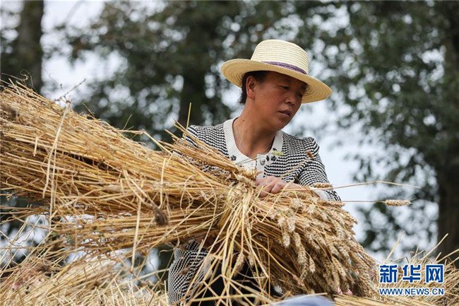 8月22日,元古堆村村民在脫麥子。 目前,在甘肅省定西市渭源縣元古堆村,村民正忙著脫麥子。當(dāng)?shù)胤N植的590多畝冬小麥近日喜獲豐收。 新華社記者 馬希平 攝