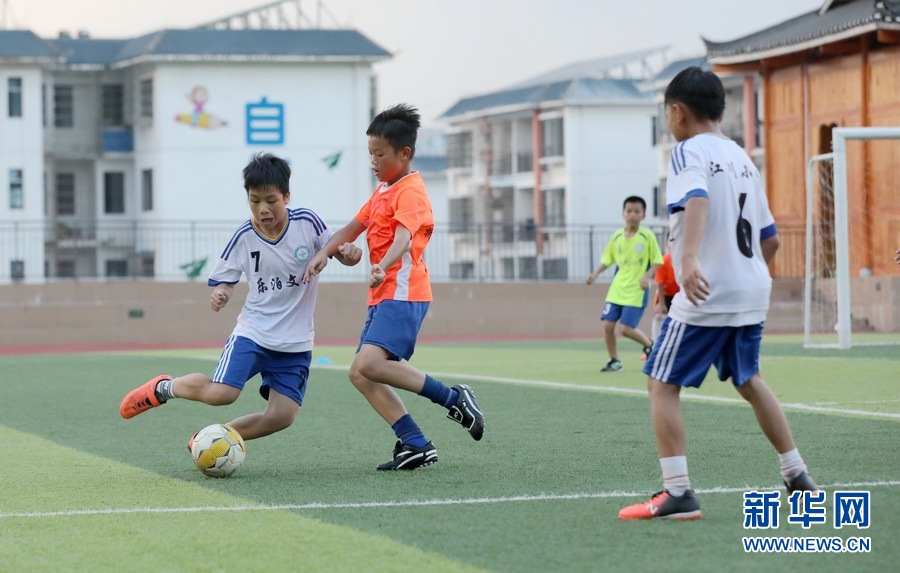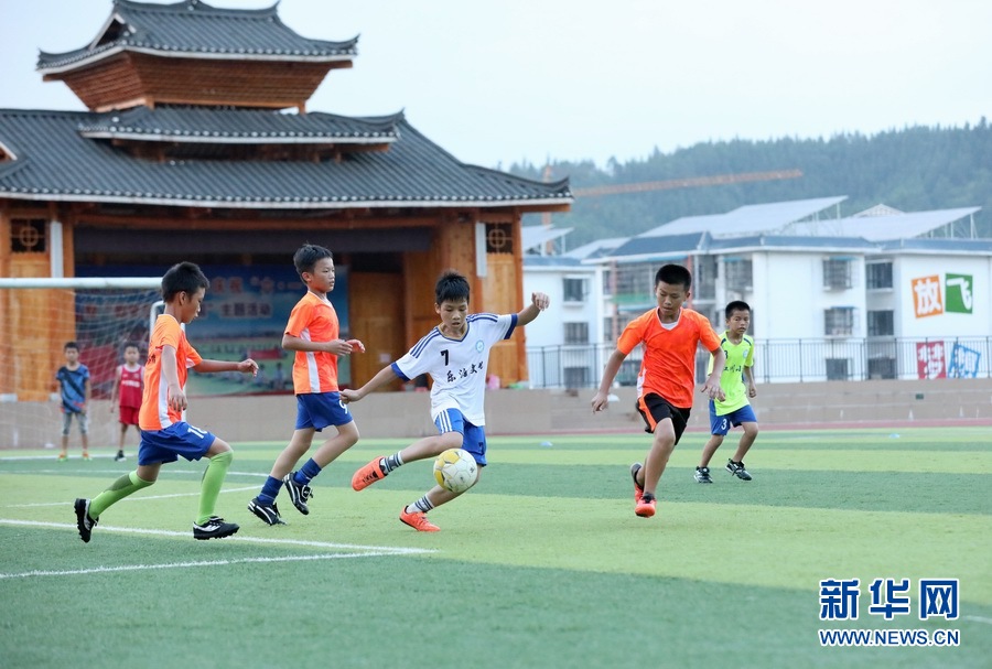 學(xué)生們在三江侗族自治縣古宜鎮(zhèn)江川小學(xué)訓(xùn)練足球。
