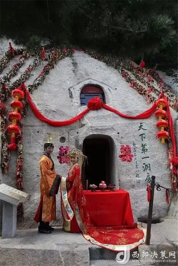 相傳春秋時期在華山修行的吹簫人簫史和秦穆公的女兒弄玉就是在華山西峰鑿洞成婚,“洞房”一詞由此誕生。天下第一洞房位于華山西峰東側(cè)半腰,從蓮花橋經(jīng)十八譚登山路的左側(cè)即達,多少年來,一對對相濡以沫的夫妻,一雙雙初次相識的戀人,攜手并肩,登頂華山,汲西峰洞房瑞氣,沐東峰朝陽祥光,恩恩愛愛漫步人生幸福路。