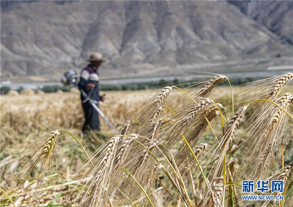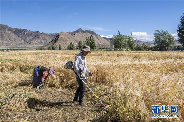 8月29日,農(nóng)民在日喀則市江孜縣的青稞田里忙收割。日喀則是西藏重要的商品糧基地,被譽(yù)為“西藏糧倉(cāng)”。當(dāng)前正值青稞收獲季節(jié),當(dāng)?shù)剞r(nóng)民抓緊收割,農(nóng)田里一片繁忙景象。新華社記者孫非攝