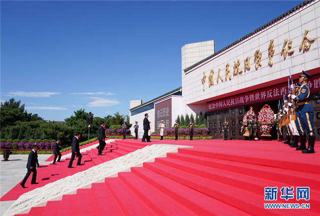 9月3日上午,習近平、李克強、栗戰(zhàn)書、汪洋、王滬寧、趙樂際、韓正、王岐山等黨和國家領導人來到中國人民抗日戰(zhàn)爭紀念館,出席紀念中國人民抗日戰(zhàn)爭暨世界反法西斯戰(zhàn)爭勝利75周年向抗戰(zhàn)烈士敬獻花籃儀式。 新華社記者 丁林 攝