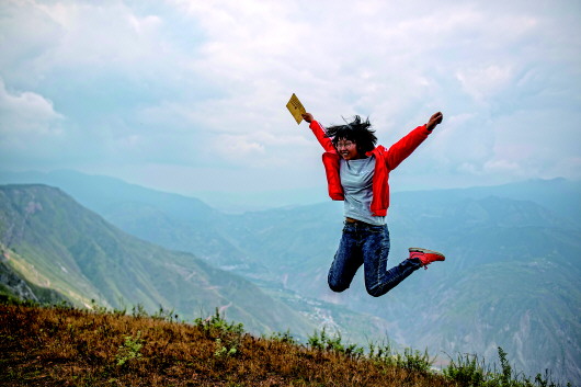 今年高考理科644分的會(huì)澤縣考生范天蘭,拿著通知書開心得蹦起來。(9月8日攝)記者江文耀攝