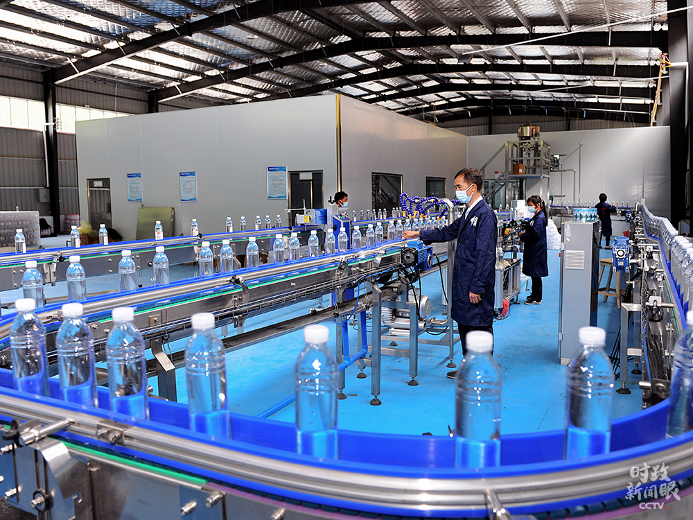 △湖南邵陽市桐山鄉(xiāng)椒林村充分利用當?shù)厣饺Y源,加工生產(chǎn)瓶裝水。