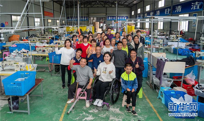 10月13日,在湖南省邵陽(yáng)市城步縣湖南七七科技股份有限公司生產(chǎn)車間,殘疾女青年楊淑亭(前排中)與工友合影。1991年出生的苗族姑娘楊淑亭因車禍胸部以下高位截癱,通過(guò)不斷學(xué)習(xí)摸索,開(kāi)辦網(wǎng)店并注冊(cè)了自己的企業(yè),與周邊貧困家庭簽訂合作協(xié)議,制作售賣(mài)具有民族特色的背包和仿真花卉,帶動(dòng)上千名貧困人員及59名殘疾人就業(yè)。