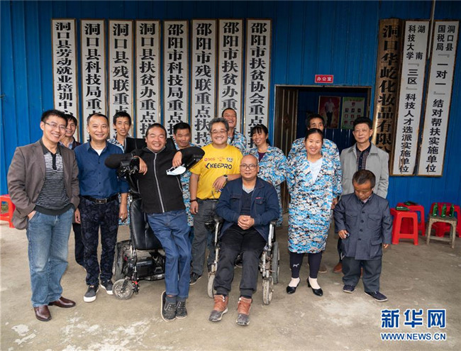 10月13日,在湖南省邵陽(yáng)市洞口縣華屹化妝品有限公司,殘疾人張赫倫(左五)與他的伙伴們合影留念。42歲的張赫倫在1998年因強(qiáng)直性脊柱炎致一級(jí)殘疾,失去生活自理能力。他通過(guò)生產(chǎn)洗發(fā)水致富,主動(dòng)吸納18名殘疾人就業(yè),還以“基地+農(nóng)戶”模式帶動(dòng)50多戶貧困戶脫貧致富。
