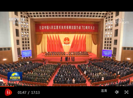 紀(jì)念中國人民志愿軍抗美援朝出國作戰(zhàn)70周年大會23日上午在北京人民大會堂隆重舉行。中共中央總書記、國家主席、中央軍委主席習(xí)近平在會上發(fā)表重要講話強(qiáng)調(diào),偉大的抗美援朝戰(zhàn)爭,抵御了帝國主義侵略擴(kuò)張,捍衛(wèi)了新中國安全,保衛(wèi)了中國人民和平生活,穩(wěn)定了朝鮮半島局勢,維護(hù)了亞洲和世界和平?;赝?0年前偉大的抗美援朝戰(zhàn)爭,進(jìn)行具有許多新的歷史特點(diǎn)的偉大斗爭,瞻望中華民族偉大復(fù)興的光明前景,我們無比堅定、無比自信。我們要銘記抗美援朝戰(zhàn)爭的艱辛歷程和偉大勝利,弘揚(yáng)偉大抗美援朝精神,雄赳赳、氣昂昂,向著全面建設(shè)社會主義現(xiàn)代化國家新征程,向著實(shí)現(xiàn)中華民族偉大復(fù)興的中國夢繼續(xù)奮勇前進(jìn)。