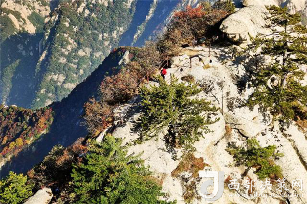 秋天的華山很是動人。天高云淡,漫山紅葉分外妖嬈,彩林賞心悅目,一步一景,滿目所見皆是驚喜。若是乘索道而上,層林金黃與郁郁蔥蔥的華山松、灰白的花崗巖山體相互迎映襯,形成了秋天多彩的西岳風光。