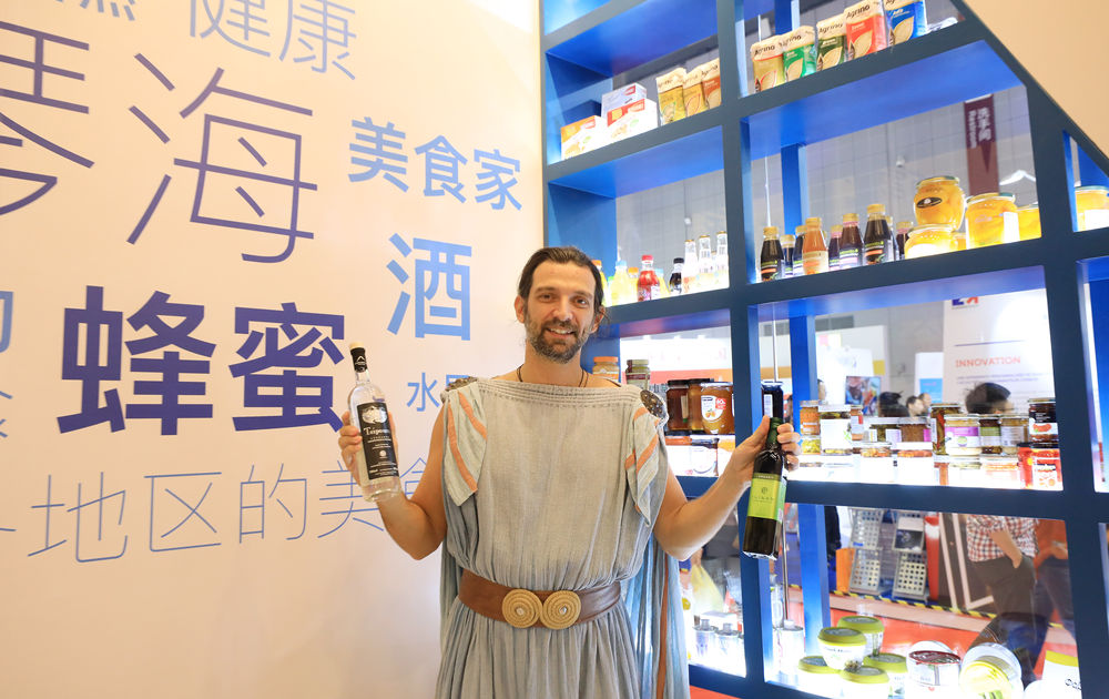 第二屆進(jìn)博會(huì)希臘館工作人員展示希臘食品。