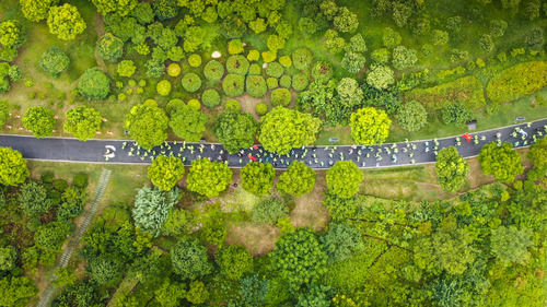 在江蘇省淮安市,體育愛好者在淮安森林公園進(jìn)行“全民健步走”活動(dòng)(8月7日攝,無人機(jī)照片)。新華社發(fā)(干石泉 攝)