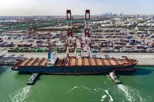 10月27日,一艘貨輪??刻旖蚋?。天津港集團(tuán)正式開通運(yùn)營今年第四條“一帶一路”新航線(無人機(jī)照片)。新華社發(fā)