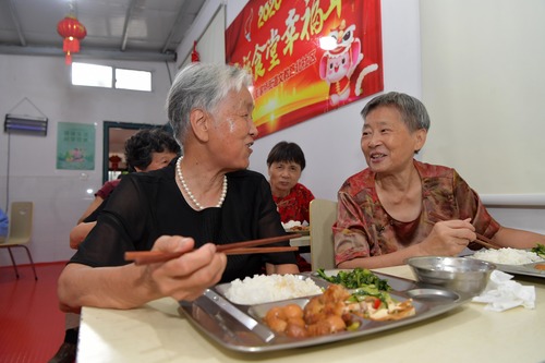 在江西省南昌市東湖區(qū)彭家橋街道文教路北社區(qū),老人們?cè)谏鐓^(qū)的“幸福食堂”吃午飯(7月29日攝)。新華社記者 彭昭之 攝