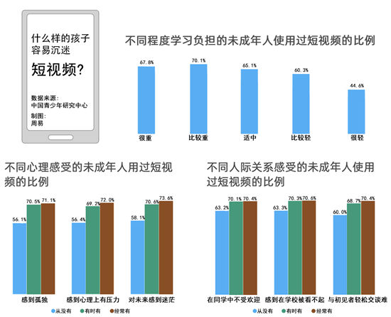 調(diào)查同時發(fā)現(xiàn),感到孤獨、心理上有壓力、對未來迷惘的中小學生接觸短視頻的比例更高。