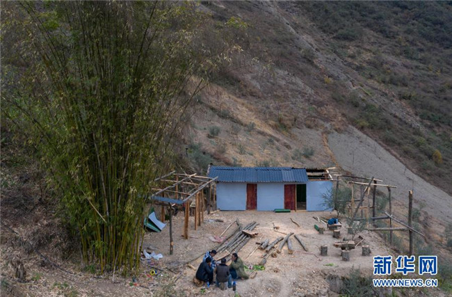 12月23日,某色蘇不惹(右二)和同伴在懸崖村修民宿。新華社記者 江宏景 攝