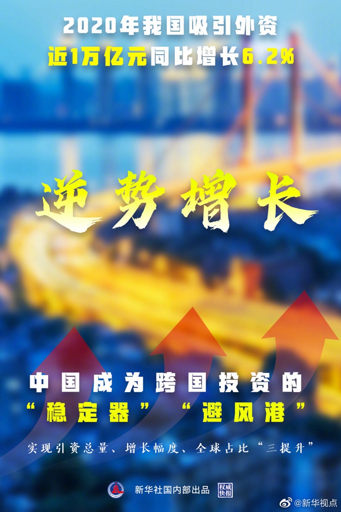 原標題:權威快報|逆勢創(chuàng)新高!2020我國吸收外資近1萬億元,同比增長6.2% 新冠肺炎疫情沖擊下,全球跨國投資大幅下降,中國引資卻逆勢增長。商務部1月20日發(fā)布數據顯示,2020年我國非金融領域實際使用外資9999.8億元人民幣,同比增長6.2%,實現了引資總量、增長幅度、全球占比“三提升”。中國成為跨國投資的“穩(wěn)定器”和“避風港”。(記者于佳欣)