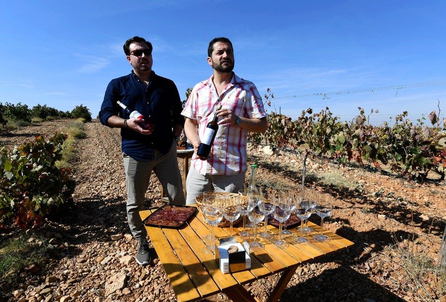2017年9月24日,在西班牙葡萄酒產(chǎn)區(qū)巴亞多利德市的一處葡萄園內(nèi),兩名村民在展示當(dāng)?shù)蒯劸频钠咸选_@里的葡萄酒有一部分會(huì)通過(guò)“義新歐”班列出口到中國(guó)。新華社發(fā) (郭求達(dá) 攝)