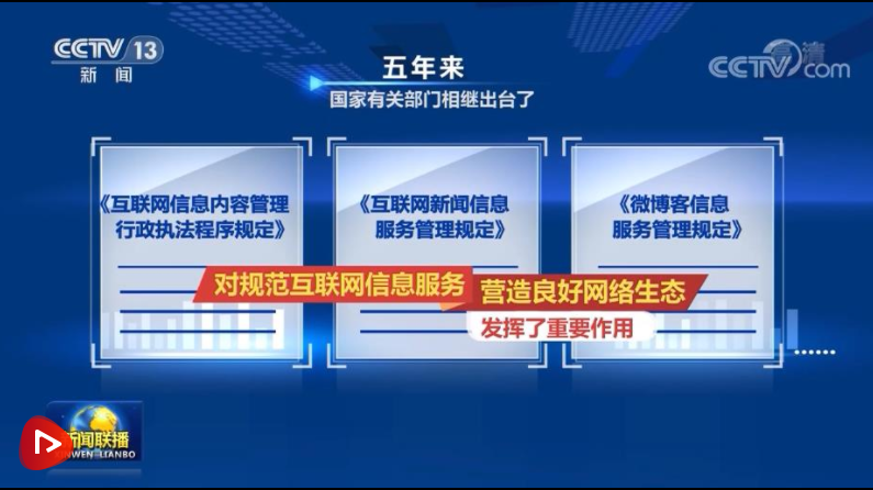 五年來,國家有關(guān)部門相繼出臺了《互聯(lián)網(wǎng)信息內(nèi)容管理行政執(zhí)法程序規(guī)定》《互聯(lián)網(wǎng)新聞信息服務(wù)管理規(guī)定》《微博客信息服務(wù)管理規(guī)定》等一系列法規(guī),對規(guī)范互聯(lián)網(wǎng)信息服務(wù)、營造良好網(wǎng)絡(luò)生態(tài)發(fā)揮了重要作用,正能量高揚(yáng),網(wǎng)絡(luò)環(huán)境日漸清朗。