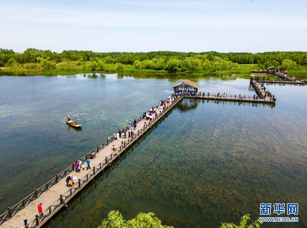 5月2日,游客在江蘇省泰州市姜堰區(qū)溱湖國家濕地公園棧道上游覽(無人機照片)。文化和旅游部5月5日晚間公布2021年“五一”假期旅游市場數(shù)據(jù)。統(tǒng)計顯示,5月1日至5日,全國國內(nèi)旅游出游2.3億人次,同比增長119.7%,按可比口徑恢復(fù)至疫前同期的103.2%。新華社發(fā)(顧繼紅 攝)