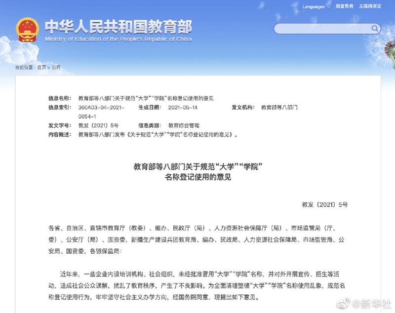 教育部等八部門近日印發(fā)意見,規(guī)范大學(xué)學(xué)院名稱登記使用。教育部表示,一些企業(yè)內(nèi)設(shè)培訓(xùn)機(jī)構(gòu)、社會(huì)組織,未經(jīng)批準(zhǔn)冒用“大學(xué)”“學(xué)院”名稱,并對(duì)外開展宣傳、招生等活動(dòng),造成社會(huì)公眾誤解,擾亂了教育秩序。意見明確,“大學(xué)”“學(xué)院”名稱經(jīng)審批方可使用。大學(xué)由國(guó)務(wù)院教育行政部門依法審批或備案;學(xué)院根據(jù)辦學(xué)層次、類型、法人性質(zhì)等,由中央和國(guó)家有關(guān)部門或省級(jí)人民政府及其有關(guān)部門依法審批。涉及機(jī)構(gòu)編制事項(xiàng)的,按照機(jī)構(gòu)編制管理權(quán)限和規(guī)定程序,報(bào)機(jī)構(gòu)編制部門審批。(記者胡浩)