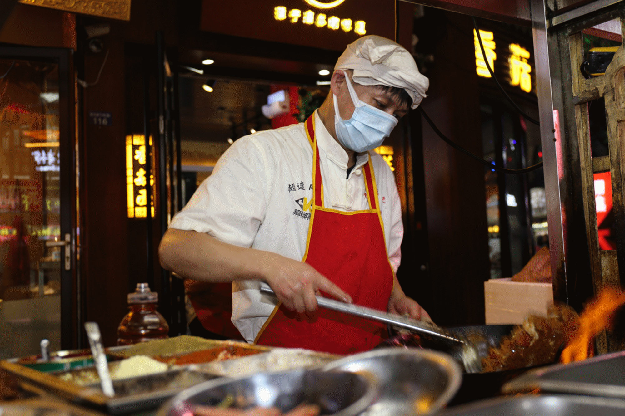 二道街,從18:00開始,道路兩旁才多了一些忙碌的身影。準(zhǔn)備食材、搭爐灶、擺桌椅,商販們一天的工作開始了。隨著人流逐漸增多,道路也變得擁擠起來。這種熙熙攘攘的氛圍,讓人心里感到特別踏實(shí)。