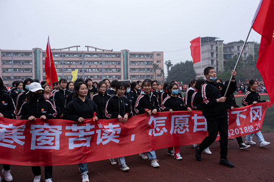 3月9日,高考誓師大會(huì)現(xiàn)場(chǎng),我們班的學(xué)生舉著橫幅和班旗,列隊(duì)準(zhǔn)備走過主席臺(tái)。橫幅上寫著“同是寒窗苦讀,怎愿甘拜下風(fēng)”。