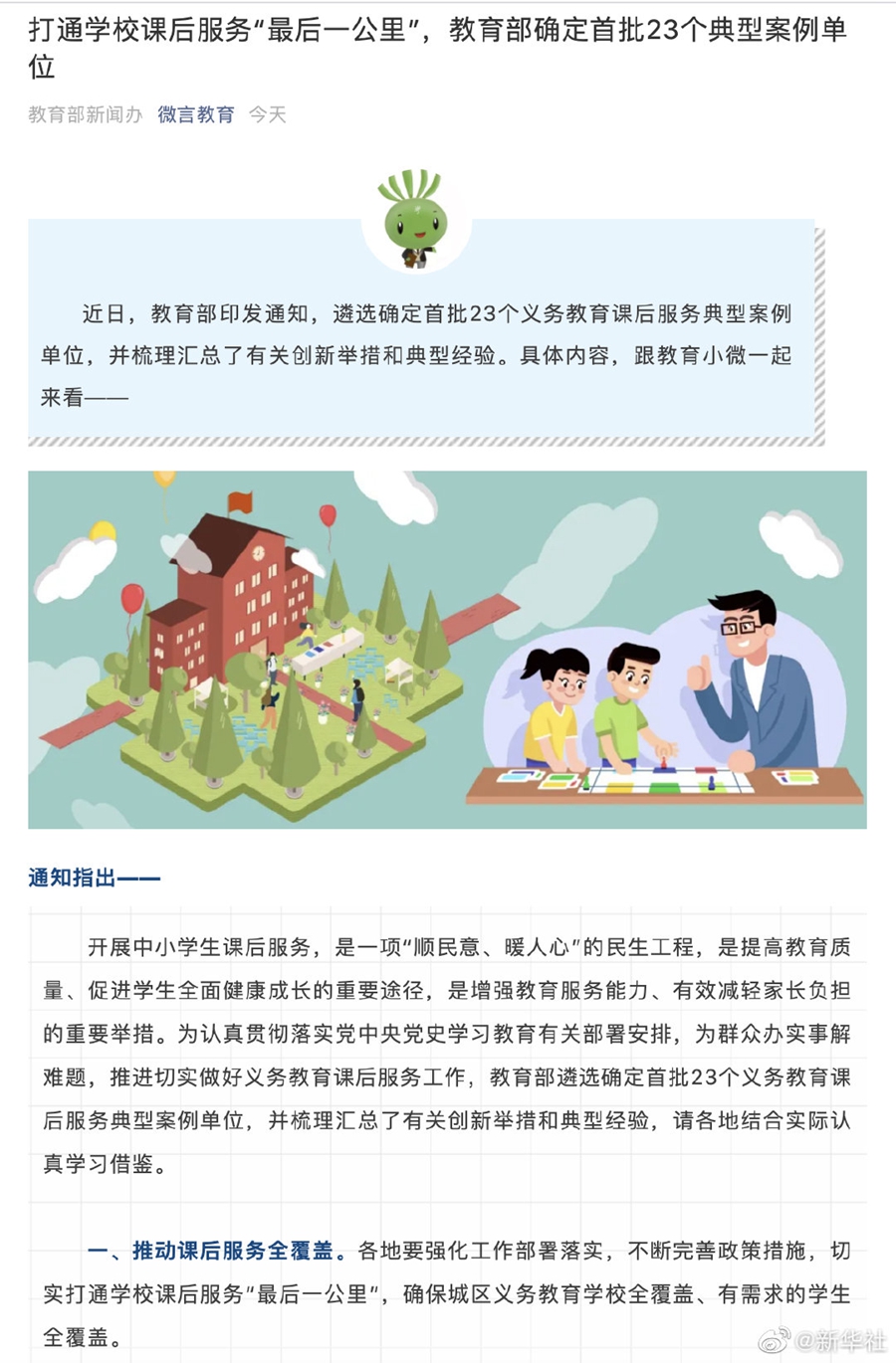 據(jù)教育部政務(wù)新媒體“微言教育”公眾號(hào)22日消息,教育部近日印發(fā)通知,為推進(jìn)做好義務(wù)教育課后服務(wù)工作,遴選確定首批23個(gè)義務(wù)教育課后服務(wù)典型案例單位,并梳理匯總了有關(guān)創(chuàng)新舉措和典型經(jīng)驗(yàn),要求各地結(jié)合實(shí)際學(xué)習(xí)借鑒。通知指出,課后服務(wù)結(jié)束時(shí)間原則上不早于當(dāng)?shù)仄毡榈恼O掳鄷r(shí)間后半小時(shí);學(xué)校對有特殊需要的學(xué)生,可以提供延時(shí)托管服務(wù),切實(shí)解決好家長接學(xué)生困難問題。學(xué)校服務(wù)性收費(fèi)和代收費(fèi)具體政策由各省份制訂,嚴(yán)禁以課后服務(wù)名義亂收費(fèi)。 (記者余俊杰)