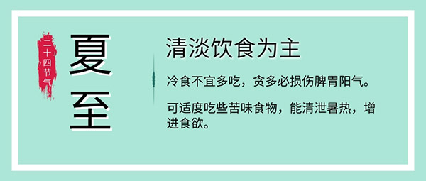 很多人有苦夏的問題,這是源于天氣炎熱,出汗較多,人體消化功能相對較弱。此時飲食宜清淡為主,多食苦味食物,如苦瓜、馬齒莧等,以祛暑清熱;同時,可多吃些生津之品,如西瓜、楊梅等,補充水分,祛除暑濕之邪;切忌過食辛辣熱性食物,以免助熱生火;食用冷食瓜果應(yīng)當適可而止,不可過食,以免損傷脾胃。