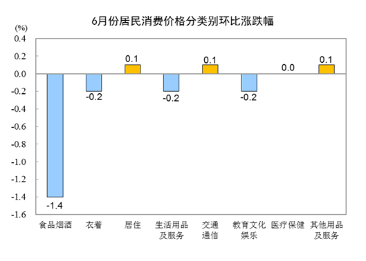 6月份,全國居民消費價格環(huán)比下降0.4%。其中,城市下降0.4%,農(nóng)村下降0.5%;食品價格下降2.2%,非食品價格持平;消費品價格下降0.6%,服務價格下降0.1%。