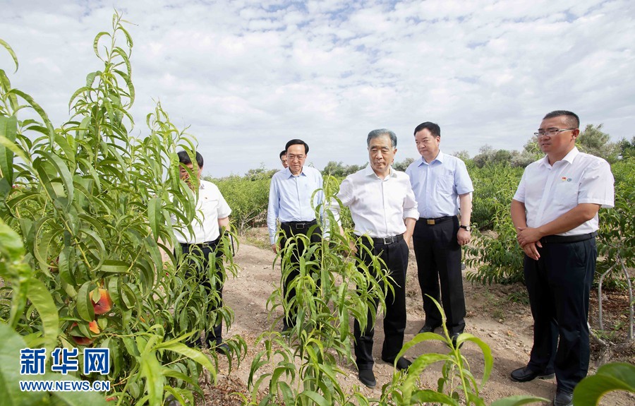 7月21日至24日,中共中央政治局常委、全國(guó)政協(xié)主席汪洋在新疆調(diào)研兵團(tuán)工作。這是23日,汪洋在兵團(tuán)十師北屯市千畝桃園了解果樹(shù)長(zhǎng)勢(shì)。新華社記者 李濤 攝