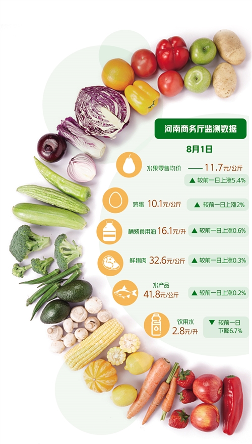 據了解,河南省商務廳自7月21日起便啟動了生活必需品市場監(jiān)測日報,對河南全省220家樣本企業(yè)、11個大類、72個品種商品實施監(jiān)測。8月1日監(jiān)測數據顯示,72個品種較前一日相比呈現“36漲14平22降”。分大類看,水果零售均價為11.7元/公斤、雞蛋10.1元/公斤、桶裝食用油16.1元/升、鮮豬肉32.6元/公斤、水產品41.8元/公斤,較前一日分別上漲5.4%、2%、0.6%、0.3%、0.2%;飲用水2.8元/升,較前一日下降6.7%;糧食5元/公斤、蔬菜5.7元/公斤,與前一日持平。