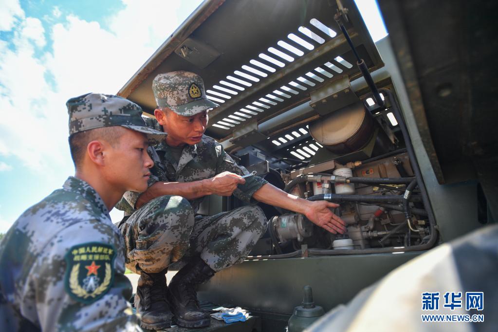 戰(zhàn)略支援部隊(duì)某大隊(duì)一級軍士長高玉華(右)演示操作要領(lǐng)(7月23日攝)。 新華社記者 陳澤國 攝