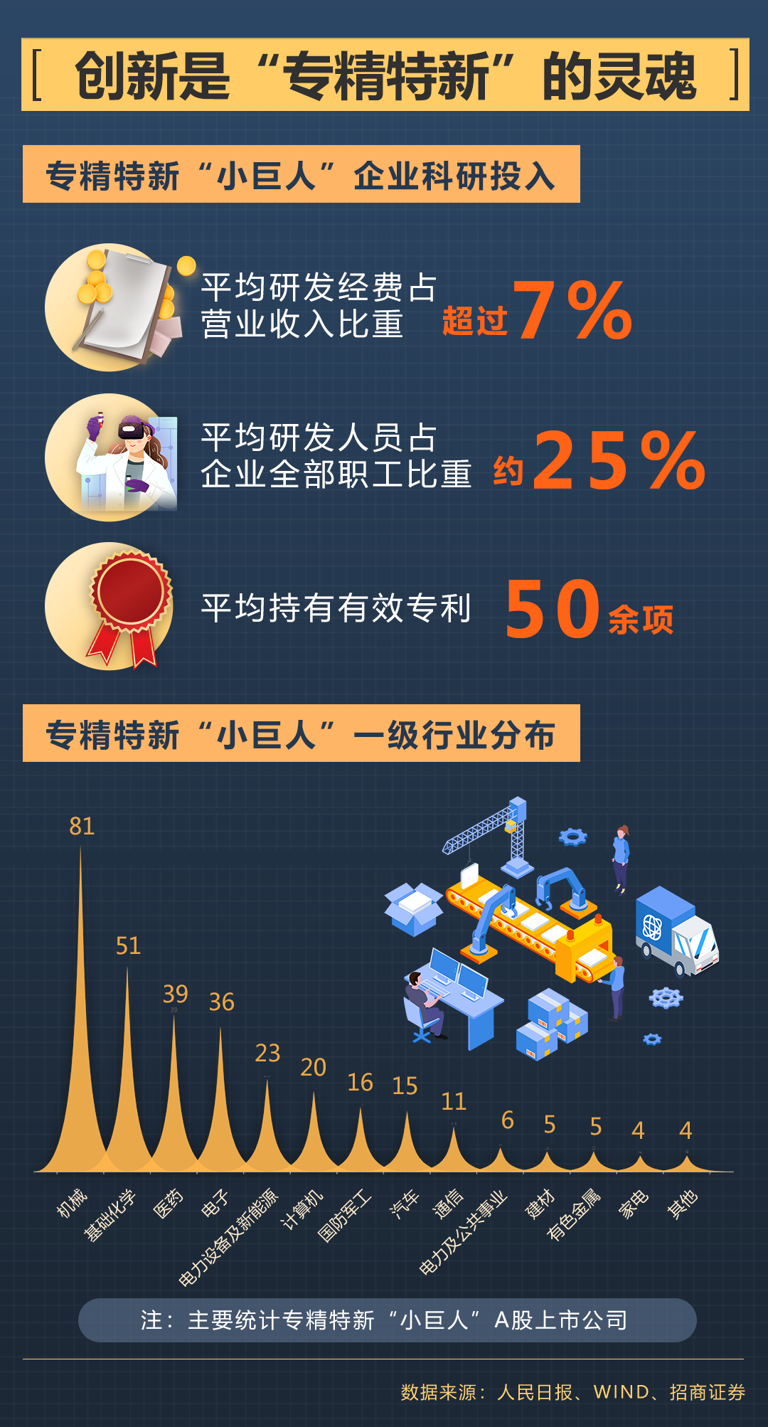 “小巨人”企業(yè)在多個(gè)關(guān)鍵領(lǐng)域?yàn)辇堫^骨干企業(yè)配套,也在細(xì)分領(lǐng)域持續(xù)創(chuàng)新并占據(jù)市場(chǎng)領(lǐng)先地位。這些企業(yè)注重制造業(yè)細(xì)分領(lǐng)域的創(chuàng)新,在上天、入海、探月、高鐵等大國(guó)工程中,都能找到“小巨人”企業(yè)的產(chǎn)品。根據(jù)招商證券統(tǒng)計(jì),A股上市的專(zhuān)精特新“小巨人”企業(yè)中,機(jī)械行業(yè)的占比最高,基礎(chǔ)化工、醫(yī)藥、電子等緊隨其后。