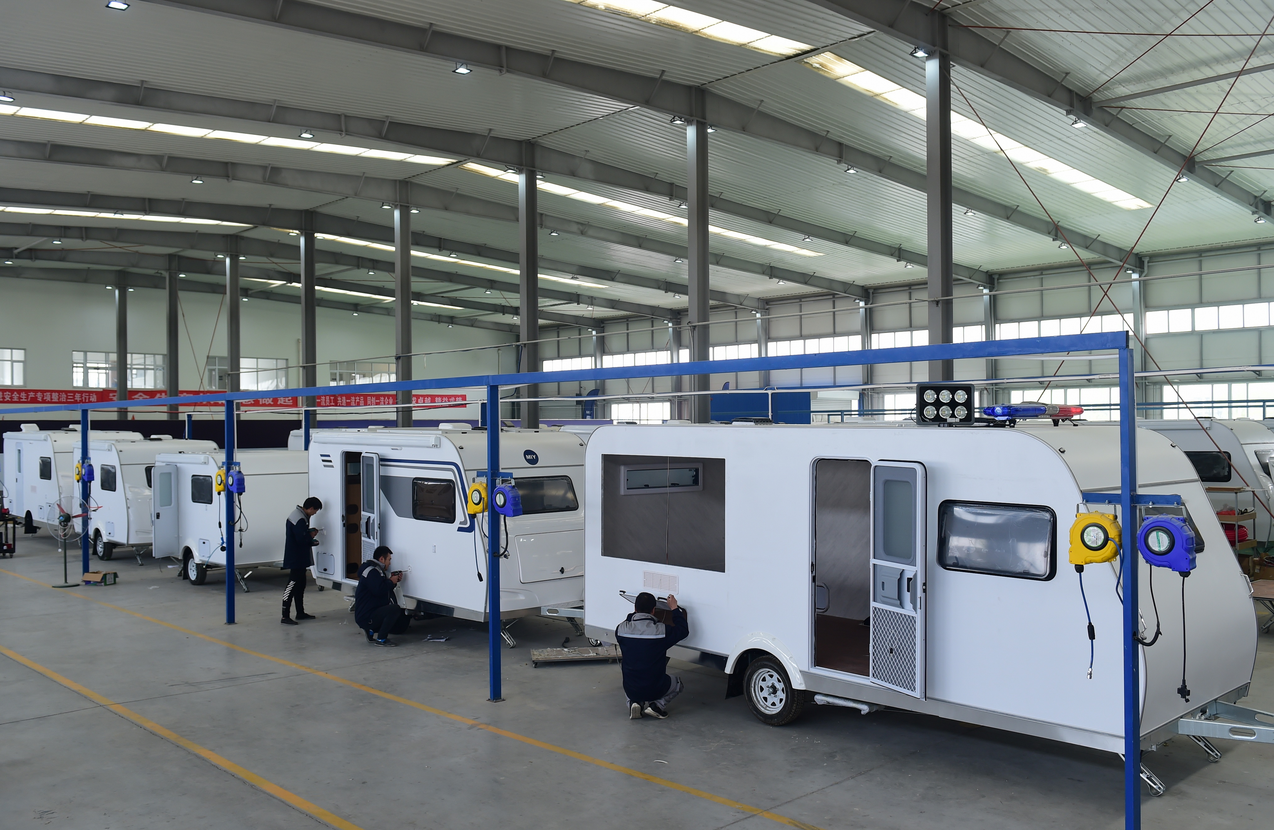 在中國(guó)—中東歐(滄州)中小企業(yè)合作區(qū),一家企業(yè)的工人在生產(chǎn)房車(chē)。新華社記者 王民 攝