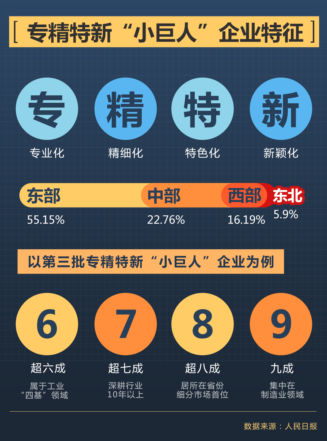 聚焦實(shí)業(yè),做精主業(yè)。第三批入選企業(yè)呈現(xiàn)出“6789”的特點(diǎn):超六成屬于核心基礎(chǔ)元器件、關(guān)鍵基礎(chǔ)材料、先進(jìn)基礎(chǔ)工藝、產(chǎn)業(yè)技術(shù)基礎(chǔ)領(lǐng)域,超七成深耕行業(yè)10年以上,超八成居所在省份細(xì)分市場(chǎng)首位,九成集中在制造業(yè)。