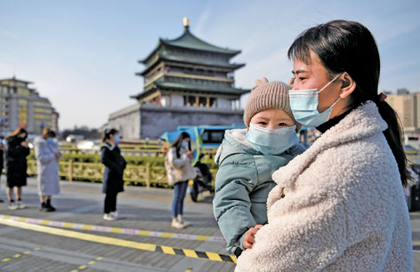 12月17日,在西安市鐘樓附近的核酸檢測(cè)點(diǎn),一位媽媽抱著寶寶排隊(duì)等待核酸檢測(cè)。新華社記者劉瀟攝