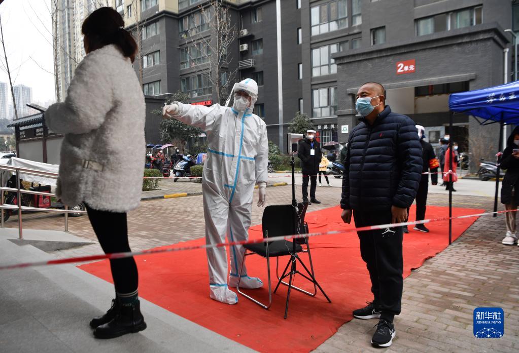 12月27日,在西安市雁塔區(qū)孟村小區(qū),盧晨陽(yáng)(左二)引導(dǎo)居民進(jìn)行核酸檢測(cè)。新華社記者 張博文 攝