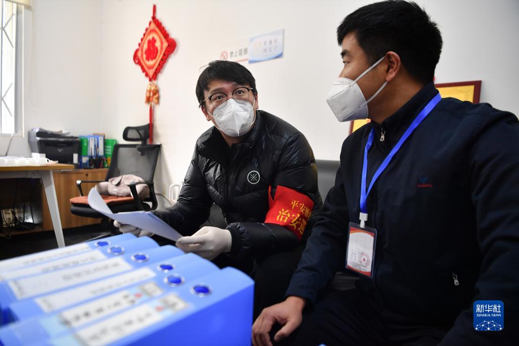 12月27日,在西安市雁塔區(qū)孟村小區(qū),盧晨陽(yáng)(左)在查閱孟村小區(qū)疫情防控臺(tái)賬。新華社記者 張博文 攝