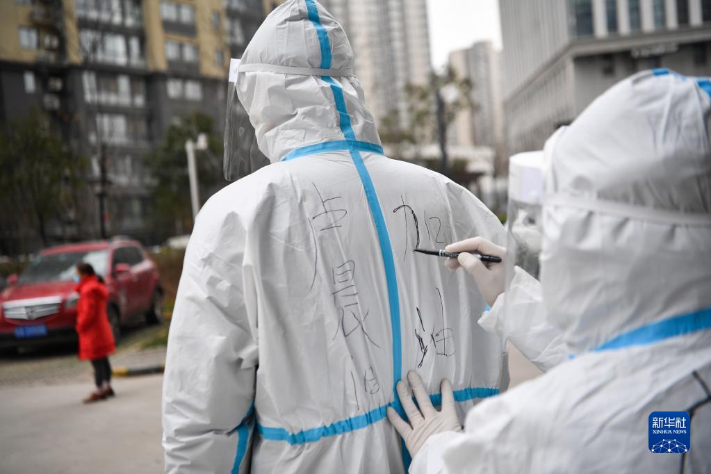12月27日,在西安市雁塔區(qū)孟村小區(qū),社區(qū)工作人員在盧晨陽(yáng)的防護(hù)服寫加油標(biāo)語(yǔ)。新華社記者 張博文 攝