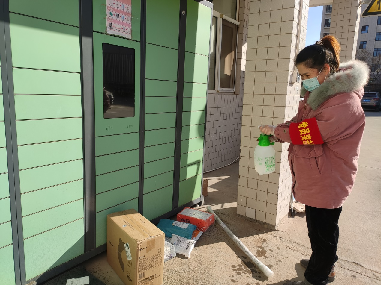 黨員突擊隊(duì)隊(duì)員索媛在值守小區(qū)對快遞進(jìn)行消毒