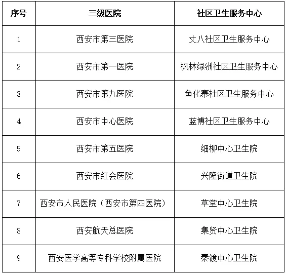 指定市屬三級(jí)醫(yī)院9家,對(duì)口支援高新區(qū)9個(gè)社區(qū)衛(wèi)生服務(wù)中心(或鄉(xiāng)鎮(zhèn)衛(wèi)生院,下同)(對(duì)口支援關(guān)系見附件),簽訂對(duì)口支援協(xié)議,下派內(nèi)科、外科、婦產(chǎn)科醫(yī)務(wù)人員駐點(diǎn)社區(qū)衛(wèi)生服務(wù)中心坐診,另外由西安市兒童醫(yī)院、西安市中醫(yī)醫(yī)院向丈八社區(qū)衛(wèi)生服務(wù)中心、楓林綠洲社區(qū)衛(wèi)生服務(wù)中心、魚化寨社區(qū)衛(wèi)生服務(wù)中心、藍(lán)博社區(qū)衛(wèi)生服務(wù)中心派中醫(yī)醫(yī)師和兒科醫(yī)師,確保社區(qū)衛(wèi)生服務(wù)中心能順利開展基本診療工作。高新區(qū)要加強(qiáng)社區(qū)衛(wèi)生服務(wù)中心硬件建設(shè),配備必要的檢查、檢驗(yàn)設(shè)備,確保能夠完成基本醫(yī)療所必需的檢查和檢驗(yàn)項(xiàng)目。支援醫(yī)院與社區(qū)衛(wèi)生服務(wù)中心建立上下轉(zhuǎn)診關(guān)系,對(duì)超出社區(qū)衛(wèi)生服務(wù)中心診療能力的轉(zhuǎn)往上級(jí)醫(yī)院進(jìn)一步診治,支援醫(yī)院應(yīng)采取預(yù)約門診、綠色通道或預(yù)留床位等方式做好支持。
