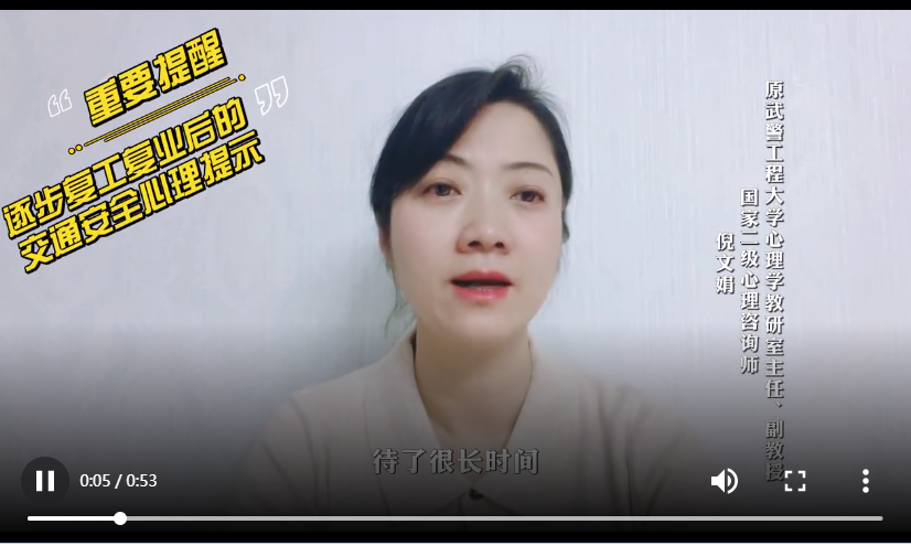隨著西安復(fù)工復(fù)產(chǎn)的推進(jìn),“開車出門”成了恢復(fù)常態(tài)化防控之后,很多市民面臨的第一件事。今天(1月15日),西安交警邀請?jiān)渚こ檀髮W(xué)心理學(xué)教研室主任、副教授,國家二級心理咨詢師倪文娟,提醒駕駛員在家中狹小的空間內(nèi)長時間封閉后,如何保持安全出行心態(tài)。