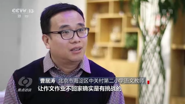 北京市海淀區(qū)中關(guān)村第二小學(xué)語(yǔ)文教師曹居濤說(shuō):“比如說(shuō)高年級(jí)的作文,讓作文作業(yè)不回家確實(shí)是有挑戰(zhàn)的,所以我們就對(duì)教與學(xué)的方式進(jìn)行了大膽的嘗試和改變。從習(xí)作布置的時(shí)間上進(jìn)行了改變,叫任務(wù)前置。孩子學(xué)習(xí)單元之初,要了解這一單元當(dāng)中的習(xí)作主題是什么,讓孩子的習(xí)作和生活建立聯(lián)系。”