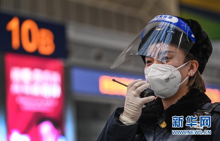 1月16日,工作人員對(duì)西安北站站臺(tái)進(jìn)行消殺。新華社記者 陶明 攝