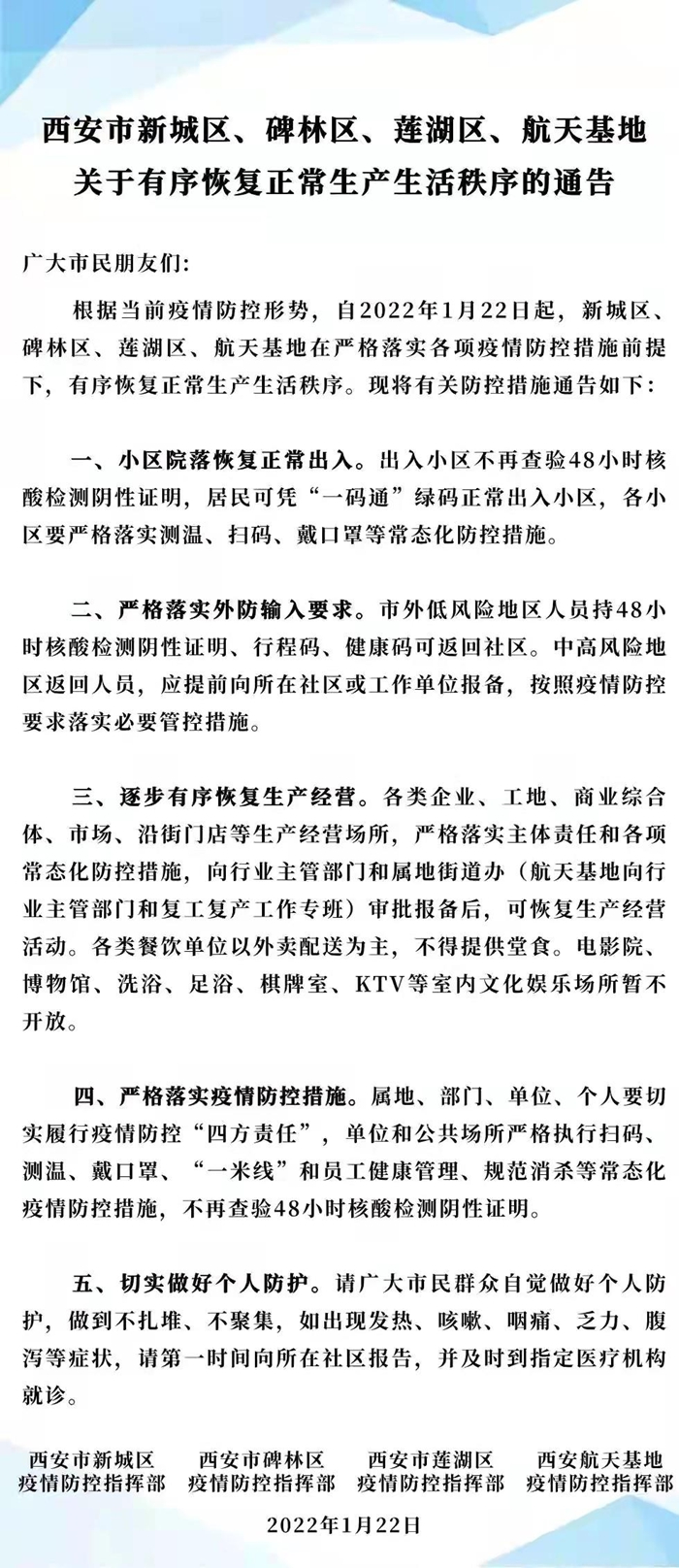 1月22日,西安市四個(gè)區(qū)域疫情防控指揮部聯(lián)合發(fā)布通告:西安市新城區(qū)、碑林區(qū)、蓮湖區(qū)、航天基地自2022年1月22日起有序恢復(fù)正常生產(chǎn)生活。通告全文如下: