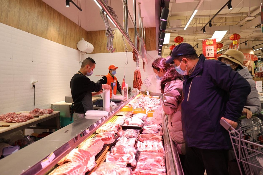 在蔬菜區(qū)、水產(chǎn)區(qū)、肉類區(qū),工作人員稱重、打包,忙得不亦樂乎。“今天一大早就有不少群眾來,各種肉類和火鍋食材賣得很快,還有顧客一次性買了800多元的肉卷。大家都說要多買點(diǎn)菜,好好吃頓火鍋。我們工作人員現(xiàn)場切肉、殺魚,也是忙得不可開交。”該超市一汪姓負(fù)責(zé)人表示,從上午的情況看,群眾購買商品的意愿都很強(qiáng),大家對各類商品的需求都很大。