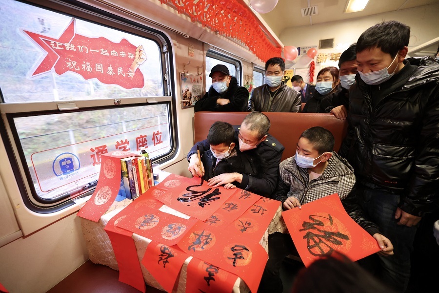 列車工作人員為旅客寫“福”字(央廣網(wǎng)發(fā) 劉松霖攝)
