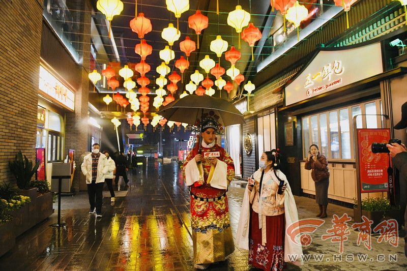 在易俗社文化街區(qū),天街燈市造型燈籠和大型石榴燈籠遠(yuǎn)觀燦若星河,近賞光影絢爛;“花落易俗”投影3D燈光秀也非常驚艷;戲曲雙水滴紅藍(lán)樹燈、“福氣高升”“雙神迎喜”、生旦凈丑、戲曲花冠燈等燈組及藝術(shù)裝置展現(xiàn)傳統(tǒng)文化魅力。