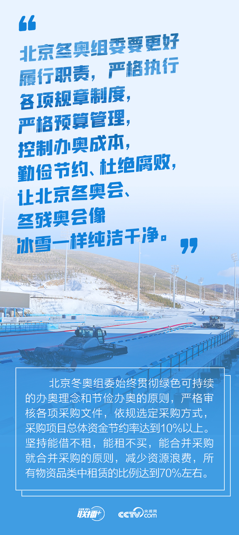 冬奧會(huì)籌辦過(guò)程中,總書(shū)記始終嚴(yán)格要求把勤儉節(jié)約作為“廉潔辦奧”的重要內(nèi)容。2021年1月20日召開(kāi)的會(huì)議進(jìn)一步提出要做好簡(jiǎn)化辦賽工作,從實(shí)際出發(fā),精簡(jiǎn)非必要環(huán)節(jié)、活動(dòng)和人員數(shù)量。
