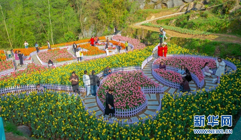 圖為在湖北來鳳縣檀木灣村萬余株郁金香競相綻放,吸引游客前來踏春賞花,“花海經(jīng)濟”助力村民增收致富。