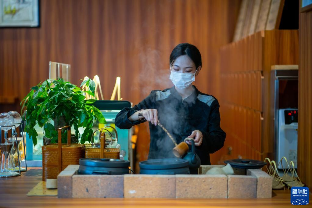 云南省普洱市的“90后”茶藝師張自穎展示當(dāng)?shù)貍鹘y(tǒng)茶葉沖泡技術(shù)(5月14日攝)。新華社記者江文耀攝